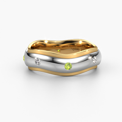 What a perfect combination of two different precious metals. They seem to reinforce each other in the modern design of this ring! Our goldsmith would be honored to create a unique ring for you, customized to your liking. Each ladies wedding ring we offer is artfully crafted by hand in our own artisan studio. That makes it possible for us to turn modern into reality and helps create your own personal ring, customized to your style. This modern WH2051L26DP ladies wedding ring is set with round peridot, is ±0.24 in (6 mm) wide and has a mat/shiny finish.