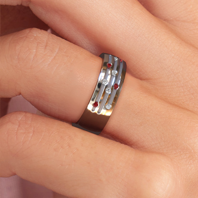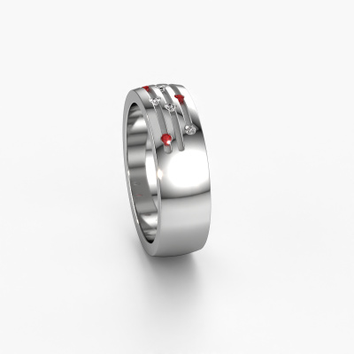 An extraordinary special ladies wedding ring! As unique as your relationship! No two people are alike and that is why you want a unique wedding ring. This modern WH0134L26B wedding ring is made by our jewel designers and crafted by hand by our goldsmith. In that process, We use pure craftsmanship combined with the latest techniques to achieve the best result. Our goldsmith strives for absolute perfection. A unique, handmade wedding ring, made to memorialize your big day! This modern WH0134L26B wedding ring is set with ruby, is ±0.24 in (6 mm) wide and has a mat/shiny finish. You can choose the combination of precious metals of your preference in our online tool. Anything goes! It is wise to browse through the characteristics of each different precious metal. For example, gold and silver are softer metals. Carat is determined by the amount of added extra metals. If the goldsmith doesn't add a lot, carat is higher and the wedding ring will be softer. If he adds more metals, the jewel has a lower amount of carat. A softer precious metal can still be used for your modern wedding ring! If you prefer a precious metal which will last a lifetime, we recommend platinum. This is the most solid and durable metal our goldsmith uses.Do you have specific wishes? Like a shiny ring, or a matte one? A wider band, or a smaller one? The possibilities of this wedding ring are endless. Be sure to contact our designers to adjust your ring to your personal taste. Did you see a ring somewhere, or do you have some special ideas of your own? Then don't hesitate to contact our designers and discuss your ideas for your own set of beautiful wedding rings. We are up for the challenge of creating the ring exactly the way you want it!Because we design and deliver our own wedding rings, we can offer you wedding rings at a price you won't find anywhere else. A ring is made to order, which helps prevent excess supplies, so we can make you a great price offer.To make it easier for you, we offer a 30 day return policy. Check our terms and conditions.