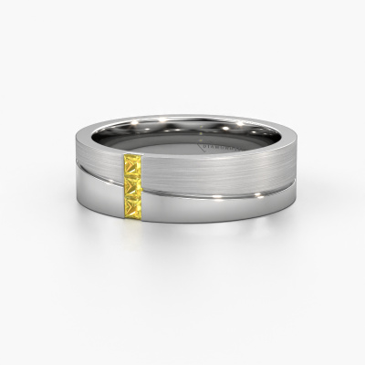 A unique two-tone platinum ladies wedding ring, designed by you, and then artfully crafted by our goldsmith in our own artisan studio! A beautiful symbol, reflecting your love, which you carry with you for a lifetime! Each ring we offer is artfully forged by hand in our own crafting studio. This makes it possible for us to create you a ring which is customized to your liking, completely mat/shiny your style. This modern WH0906L16A wedding ring is set with yellow sapphire, is ±0.24 in (6 mm) wide and has a mat/shiny finish. You can choose the combination of precious metals of your preference in our online tool. Anything goes! It is wise to browse through the characteristics of each different precious metal. For example, gold and silver are softer metals. Carat is determined by the amount of added extra metals. If the goldsmith doesn't add a lot, carat is higher and the wedding ring will be softer. If he adds more metals, the jewel has a lower amount of carat. A softer precious metal can still be used for your modern wedding ring! If you prefer a precious metal which will last a lifetime, we recommend platinum. This is the most solid and durable metal our goldsmith uses.Do you have special preferences regarding your wedding ring? For instance, a smaller or a wider band? Or perhaps a shiny or a matte ring? There are numerous variations possible. You can always discuss the possibilities with our jewelry designers. If you have certain wedding rings in mind, our designers will gladly help by drawing the rings of your dreams. Be sure to contact us!After receiving your order, our goldsmiths will start the creative process of making your wedding rings. We don't keep stock. This is advantageous because these costs will not be passed on to you. Therefore, our quality wedding rings are always priced 30 percent lower than those of other jewelers.To make it easier for you, we offer a 30 day return policy. Check our terms and conditions.